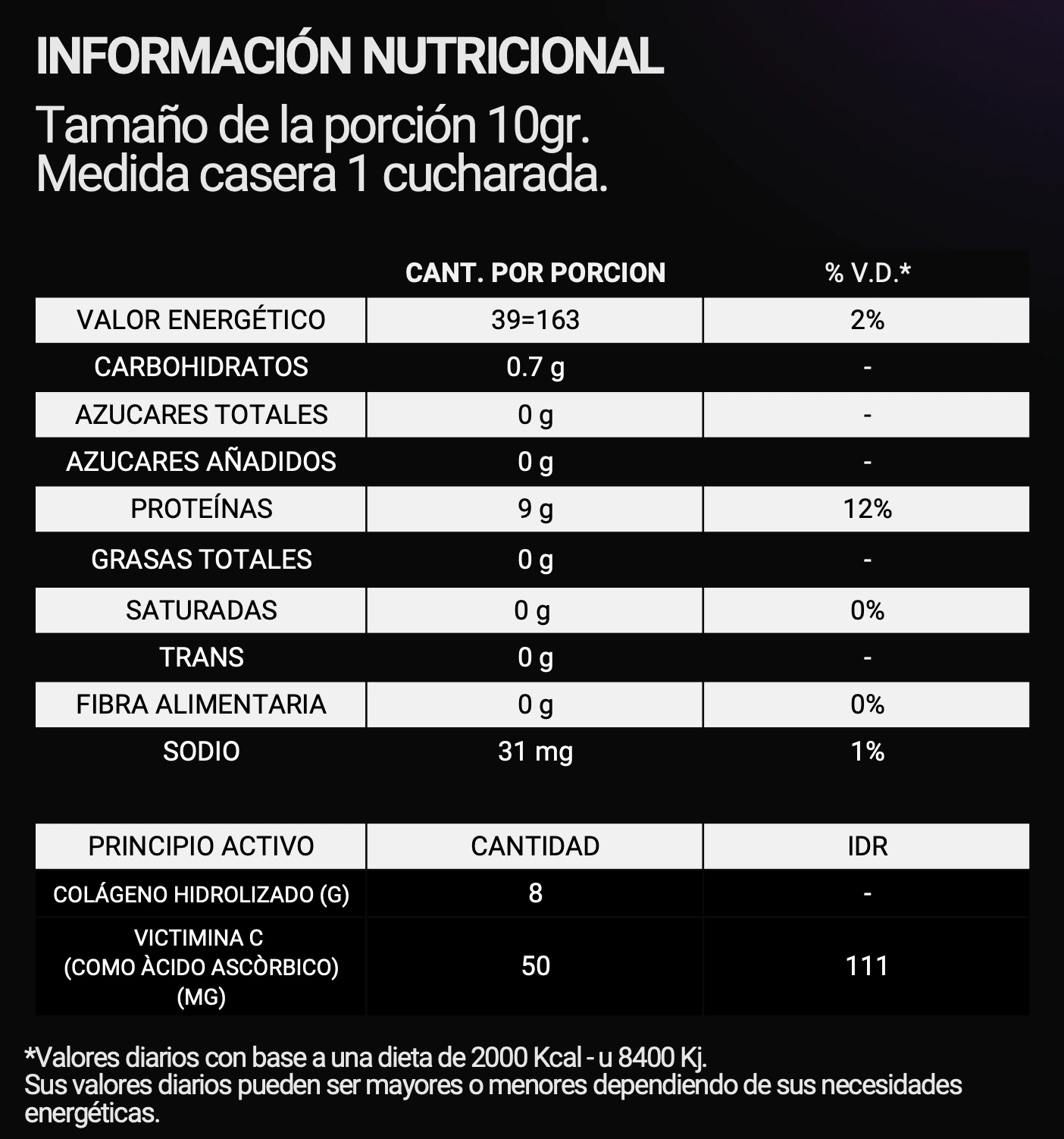 No utilizar en caso de embarazo, mujeres en período de lactancia ni en niños. Mantener fuera del alcance de los niños. Consumir este producto de acuerdo a las recomendaciones de ingesta diaria establecidas en el rótulo. El consumo de suplementos dietarios no reemplaza una dieta variada y equilibrada. Este producto supera la ingesta diaria recomendada en Vitamina C. Consulte a su médico y/o nutricionista. Si está tomando otros suplementos dietarios, lea el envase, ya que pueden contener los mismos ingredientes. Su consumo debe realizarse bajo control médico. Aporta 8 gramos de colágeno hidrolizado y 50 mg de ácido ascórbico (Vitamina C – 111 % IDR) por porción. Contenido de edulcorantes: potasio acesulfamo – 830 mg/100g, sucralosa – 330 mg/100g. No aporta cantidades significativas de: Grasas totales, Grasas saturadas, Grasas Trans y Fibra alimentaria.
