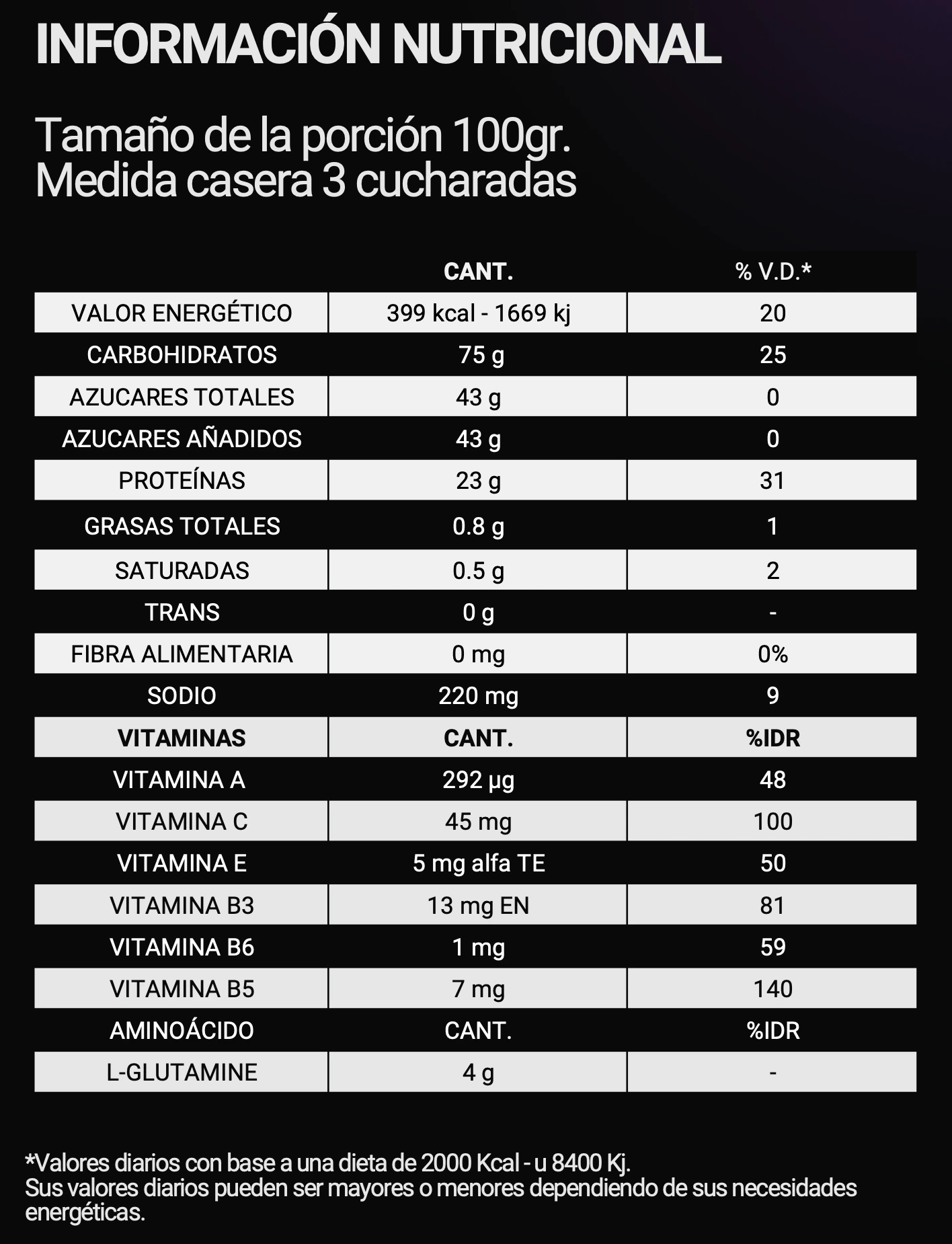Aporta 14 gramos de Maltodextrina, 14 gramos de Dextrosa, 14 gramos de Fructosa y 4 gramos de L-Glutamina por porción. Una medida es igual a una cuchara dosificadora incluida dentro del envase.
